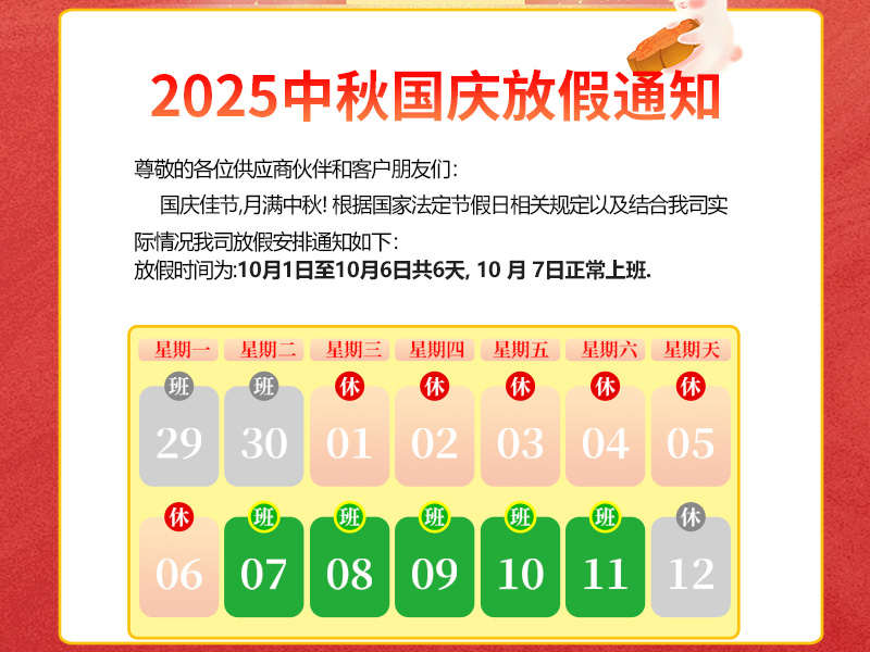 尊敬的各位供應商伙伴和客戶朋友們:國慶佳節(jié),月滿中秋!國慶家園月圓人團園,國慶中秋雙節(jié)共歡騰!在此預祝大家度過一個輕松、愉快的假期.根據國家法定節(jié)假日相關規(guī)定,再結合我司實際情況,現將2025年國慶中秋節(jié)放假安排通知如下:放假時間定為10月1日至10月6日(星期三至星期一),共計6天.2025年 10月 7日(星期二)正式上班,假日期間如有業(yè)務需求可電話咨詢業(yè)務,感謝大家的理解與配合!秋高氣爽迎中